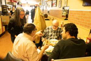 Braciole Literary Journal founder Rafael Alvarez — with former Fells Point bookshop owner Stan Modjesky (center) and journalist Tim Prudente (right) — meet with friends at G&A Coney Island Hot Dogs in Highlandtown to gather material for a history of poetry in Baltimore. Photo: Mark Cates